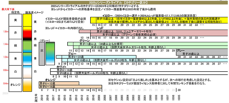 最上位のイエローは別途指定されたUCI/JCF競技者登録に限ります。その他もJCF競技者登録を推奨しますが、エントリー時に「ワンデイライセンス」(臨時登録)を選択することで参加できます。大会当日の受付で500~1,000円の登録料支払いが必要となります。